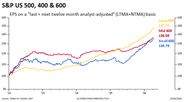 That is understandable when you look at the health of the US economy, where most of the world’s largest stocks derive most of their revenue. US citizens are angry about fuel prices and there are signs of slowing ‘real’ spending, but there is no sign of stress in the labour market data. Going into the Q1 corporate earnings season, earnings growth expectations are high. There is little sign that companies have been hit by the war. On the contrary, growth has accelerated across small, mid and large cap companies. The chart below shows US equity indices’ earnings per share, on our favoured metric (combined last twelve month and expected next twelve month earnings, all indexed to the start of 2022):