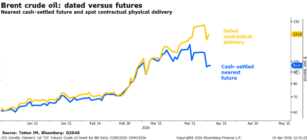 Markets might therefore be a little too optimistic. There is a disconnect between the relief in oil and equity markets, and the scramble for resources we see in the real economy. This is clearest in the difference between current oil prices and so-called spot dated price – which guarantee future oil delivery, a little different to a standard futures contract. The chart below shows spot dated oil price for June delivery is nearly 40% above the current near-contract futures prices, reflecting an extreme supply crunch in the next few weeks:
