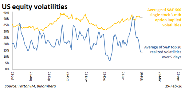 Markets were quiet up to that point. We wrote last Friday that individual stock-level volatility was significantly higher than index-level volatility, but stock-level volatility fell this week (chart below). Markets are still preoccupied with AI disruption and the underperformance of large cap stocks, relative to small cap, but selling pressures have dissipated, and the dollar bounced (before the tariff news) against most developed world currencies.