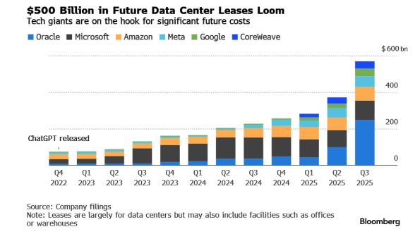 While tech stocks are still under some pressure, the pain is currently being borne by those trying to break open the Magnificent Seven clique – mostly Oracle and Broadcom. Oracle’s expansion issues continue; Blue Owl, the private equity and credit manager decided not to participate in the financing for (yet another) Oracle-led data centre in Michigan. These new data centres are not owned directly by the tech firms that institute them – rather, the sponsoring firms such as Oracle contract to lease the facilities for a long period, and money is raised against the value of that lease. Bloomberg has estimated the value of the leases to which the firms have committed in each quarter over the past three years: