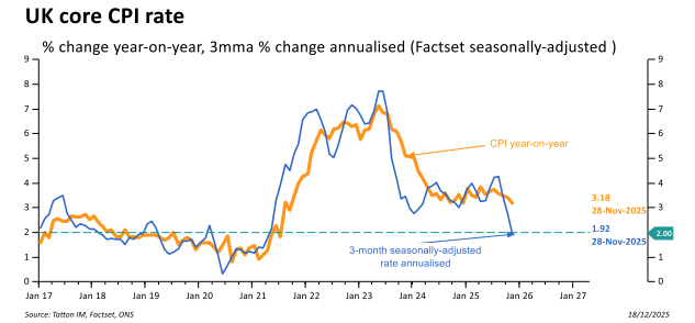 In the US, this week’s flood of data included the employment report which was weakish (unemployment rose from 4.4% to 4.6%, with government layoffs surging), and culminated in Thursday’s US inflation report, surprising even more than the UK in its softness. November overall CPI rose by (the same as in Japan) 2.7% year-on-year, with core at 2.6% year-on-year. Both were 0.4% lower than expectation, a big difference.