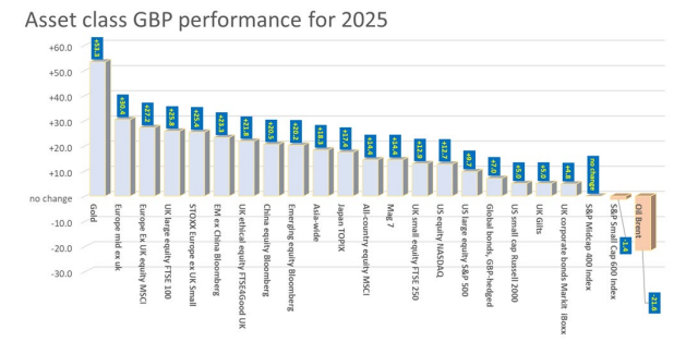 We will give a more detailed review of asset and sub-asset class performances for 2025 in next week’s missive. In the meantime, we show many of the year’s sterling-based returns , ranked from best to worst. A very Happy New Year to all of you!