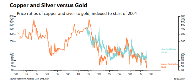 Copper has hit all-time highs in US dollar terms but, when measured against precious metals, it looks cheap, as the graph below shows. Oil is even cheaper.