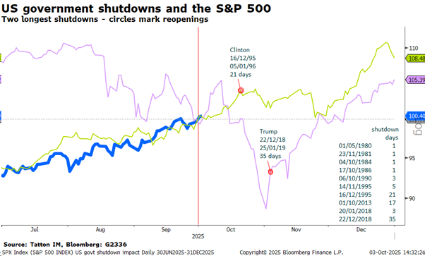 The US government shutdown drama is back on our screens – but markets are not tuning in. Stocks did not even bristle at Trump’s suggestion that the budget deadlock could be used as pretext for firing more federal employees, a kind of DOGE-by-proxy. Perhaps markets just see the government shutdown as mere political theatre that will be resolved (as it always has), or perhaps they think the economic impact will be mild. A quick resolution looks unlikely, but previous federal cuts under DOGE did not hurt US growth too much.
